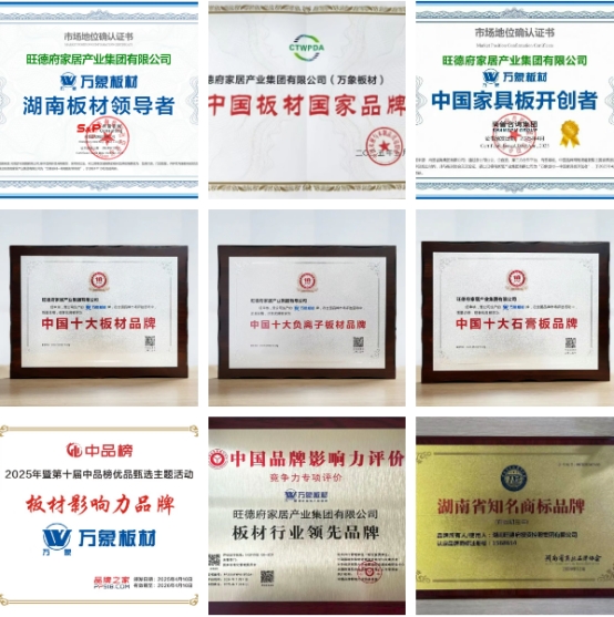 集团旗下拥有的万象板材作为“湖南板材领导者”,以二十六年的品质坚守和创新探索,赢得了消费者良好的口碑与行业高度的肯定。先后荣获“中国驰名商标”、“中国十大板材品牌”、“中国家具板开创者”、“中国十大健康品牌”、“中国十大生态板品牌”、“环保板材十大品牌”等实力殊荣以及“中国环境标志产品认证”、“无醛人造板及其制品认证”等行业专业资质认证。