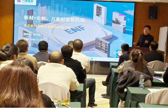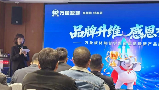 万象板材省外加盟中心长江以北战区经理李毅先生随后登台,聚焦全新推出的万象博耐克系列产品展开专业分享。针对产品研发理念、核心材质优势、环保性能指标、适用场景拓展等维度进行全方位解析,让在场渠道伙伴深入了解新品的差异化亮点与市场竞争潜力。